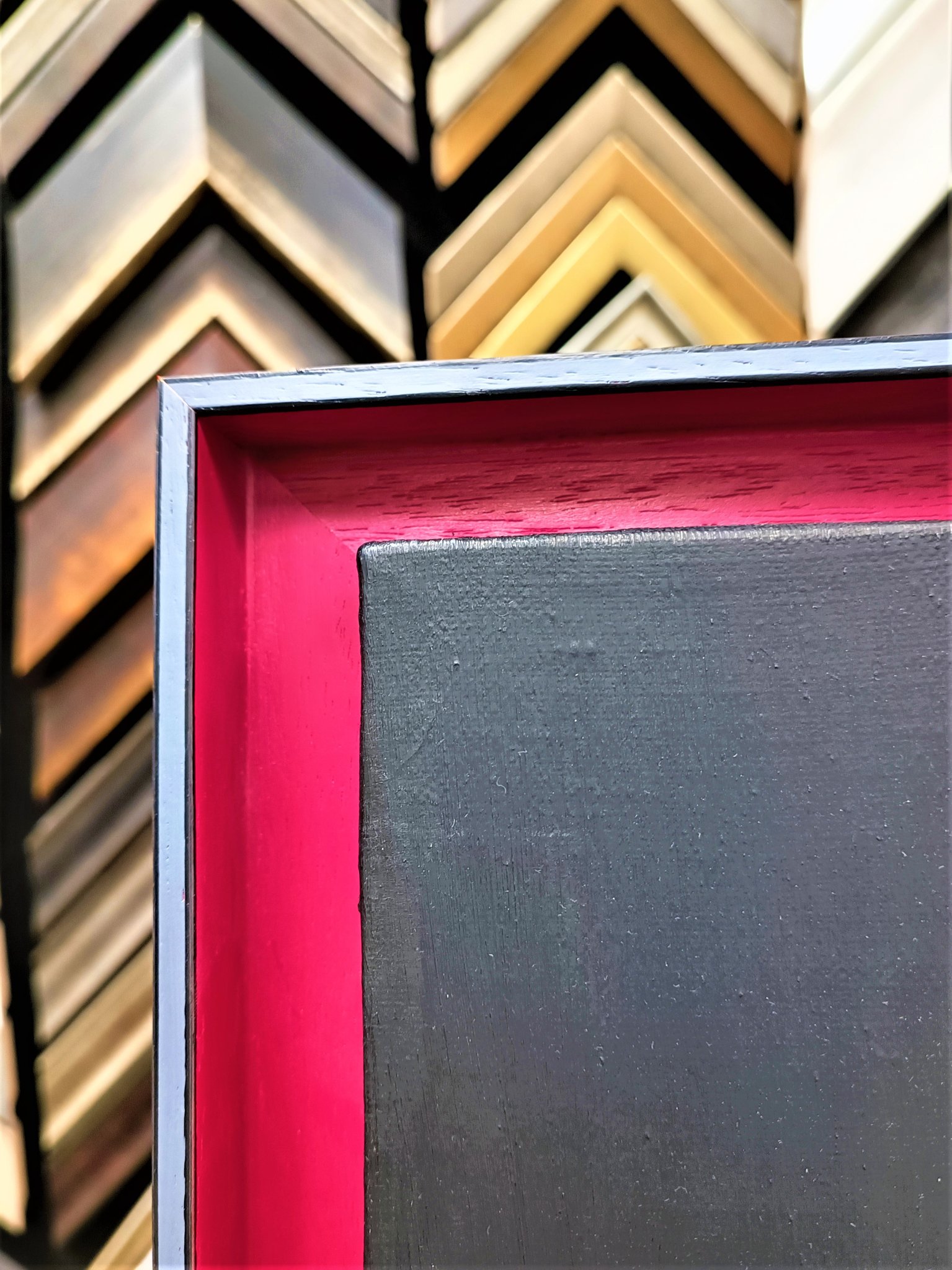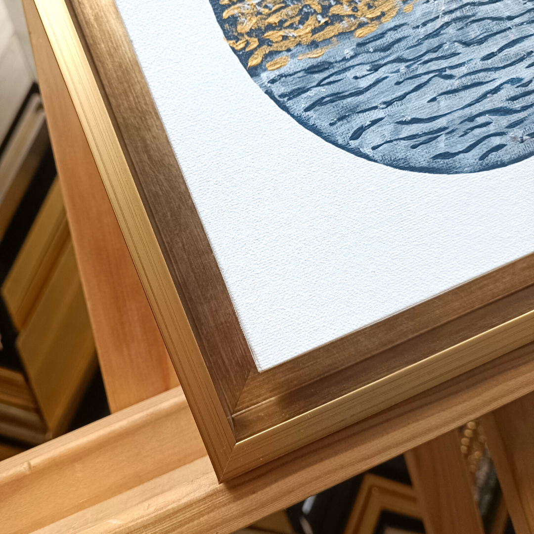 Une fois tendue sur châssis votre toile peut être encadrée avec des baguettes classiques ou bien en Caisse Américaine.