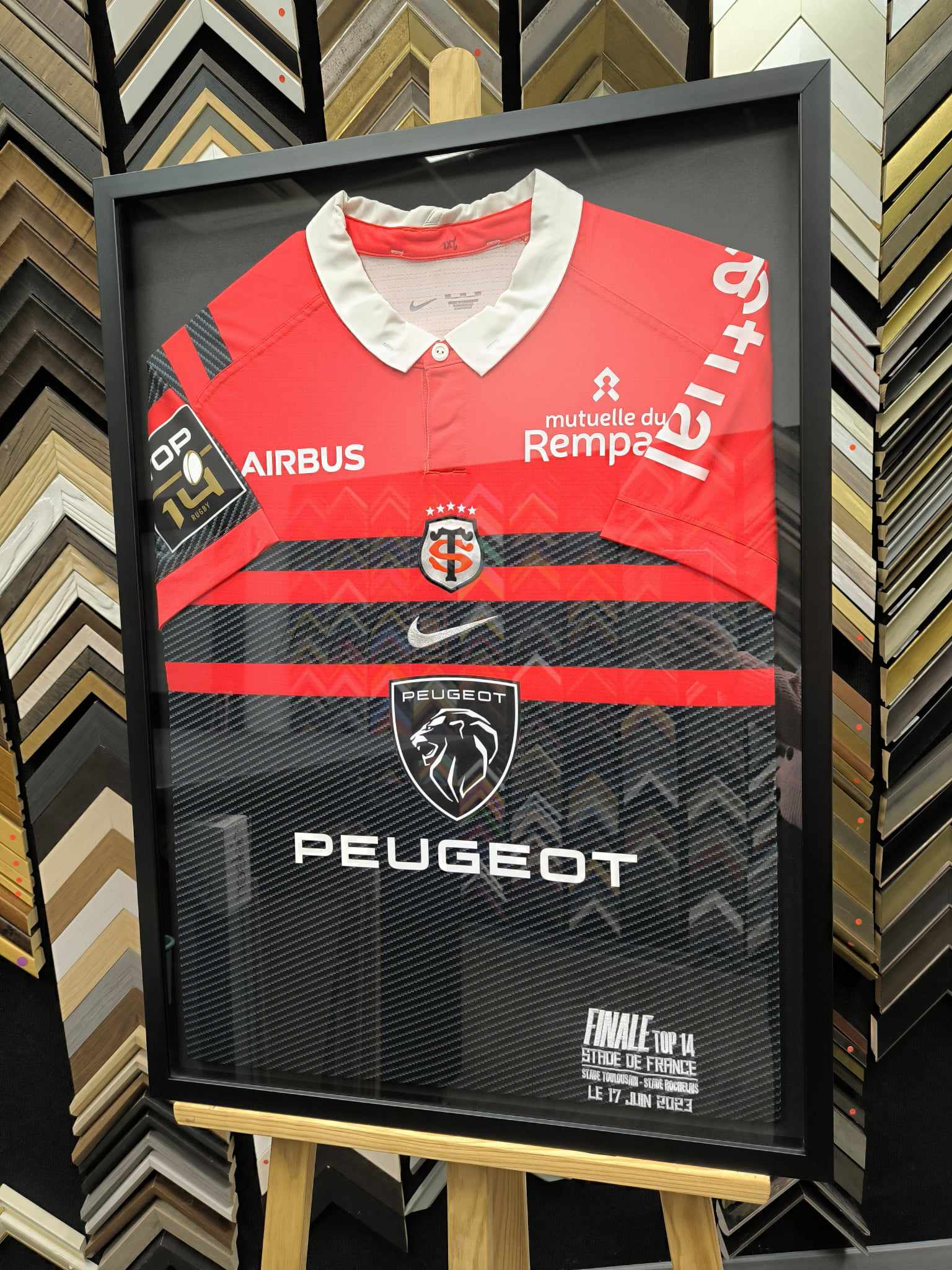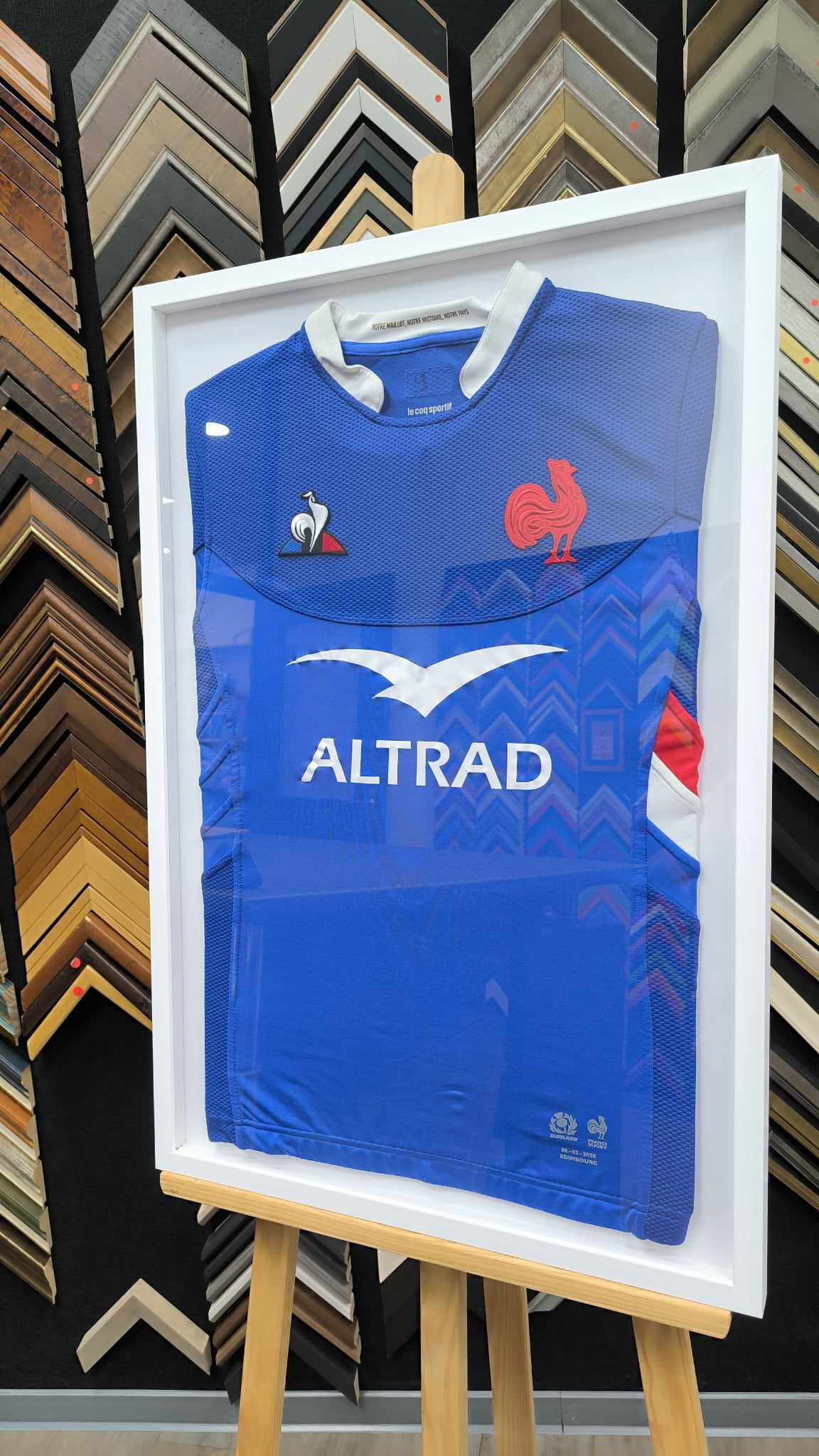 Créer le cadre vitrine d’un maillot de sport aux couleurs de son équipe de rugby ou de foot. Choisissez la couleur de la baguette et du fond de votre encadrement.